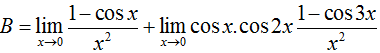 Tìm giới hạn B=limx→01-cos x.cos 2x.cos 3x x2