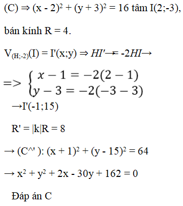 Trong mặt phẳng tọa độ Oxy cho đường (C) có phương trình . Qua phép vị tự tâm H(1;3) tỉ số k = -2, đường tròn (C) biến thành đường tròn (C’) có phương trình.