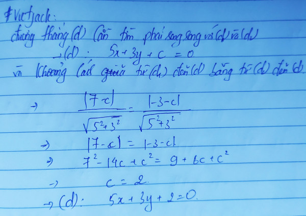 Lập phương trình đường thẳng cách đều hai đường thẳng (d1): 5x+3y-3=0 và (d2): 5x+3y+7=0.