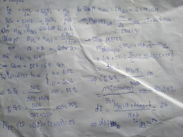 1) Cho 6,4 g hỗn hợp gồm Fe và FeS phản ứng đủ với dd HCI 20%, thu được 1,792 lít đkc hh khí B.Tính: