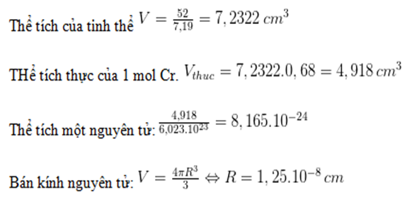Trong tinh thể, nguyên tử crom chiếm 68% về thể tích. Khối lượng riêng của kim loại crom là 7,19 g/cm3. Bán kính nguyên tử tương đối của nguyên tử Cr là (biết khối lượng mol của Cr = 52)