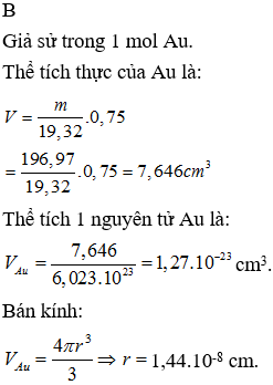 Ở khối lượng riêng của Au là . Trong tinh thể Au, các nguyên tử Au là những hình cầu chiếm 75% thể tích toàn khối tinh thể, phần còn lại là các khe rỗng giữa các quả cầu. Khối lượng mol của Au là 196,97. Bán kính nguyên tử gần đúng của Au ở là