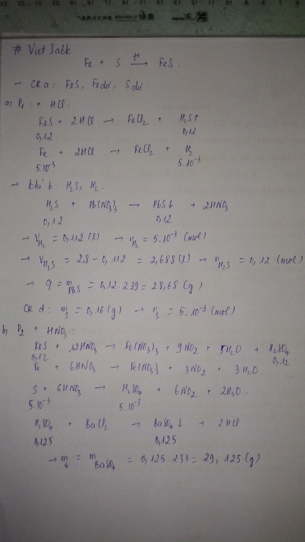 Nung p gam hỗn hợp Fe và S ( không có mặt oxi) một thời gian , sau đó làm nguội được hỗn hợp chất rắn a. nghiền nhỏ trộn đều a rồi chia thành hai phần bằng nhau.