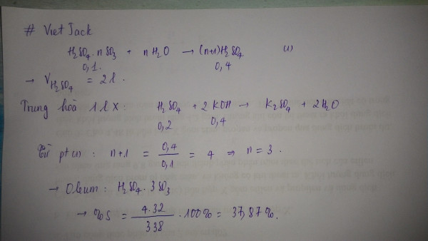 Cho 0,1 mol một loại hợp chất oleum vào nước thu được 2,0 lít dung dịch X. Để trung hoà 1 lít dung dịch X cần dùng 400 ml dung dịch KOH 1M. Phần trăm về khối lượng của nguyên tố lưu huỳnh trong oleum trên là