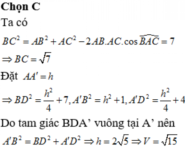 Cho lăng trụ đứng ABC.A'B'C' có AB=1, AC=2, góc BAC=120°. Giả sử D là trung điểm của cạnh CC' và BDA'=90°. Thể tích lăng trụ bằng bao nhiêu?