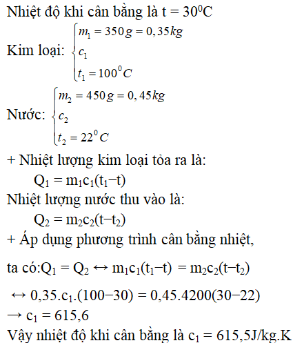 Bỏ vào nhiệt lượng kế chứa 450g nước ở nhiệt độ C một miếng kim loại có khối lượng 350g được nung nóng tới C. Nhiệt độ khi cân bằng nhiệt là C. Bỏ qua nhiệt lượng làm nóng nhiệt kế và không khí; lấy nhiệt dung riêng của nước là 4190J/kg.K. Nhiệt dung riêng của kim loại đó là:
