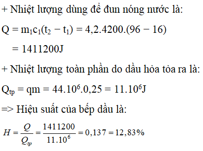 Đốt cháy hoàn toàn 0,25kg dầu hoả mới đun sôi được 4,2 lít nước ở C nóng tới C. Biết năng suất toả nhiệt của dầu hoả là q = J/kg. Hiệu suất của bếp dầu là: