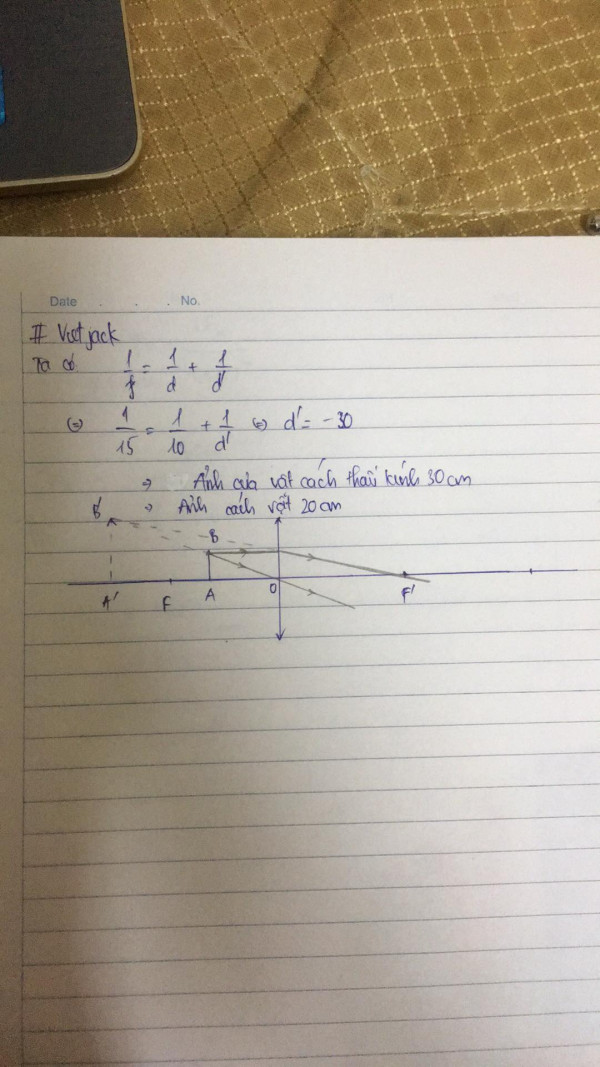 Một vật sáng dạng đoạn thẳng được đặt vuông góc với trục chính của một thấu kính hội tụ có tiêu cự 15 cm. Vật sáng được đặt cách thấu kính 10cm. Vẽ ảnh của vật qua thấu kính và tính khoảng cách từ ảnh đến vật.