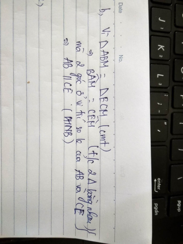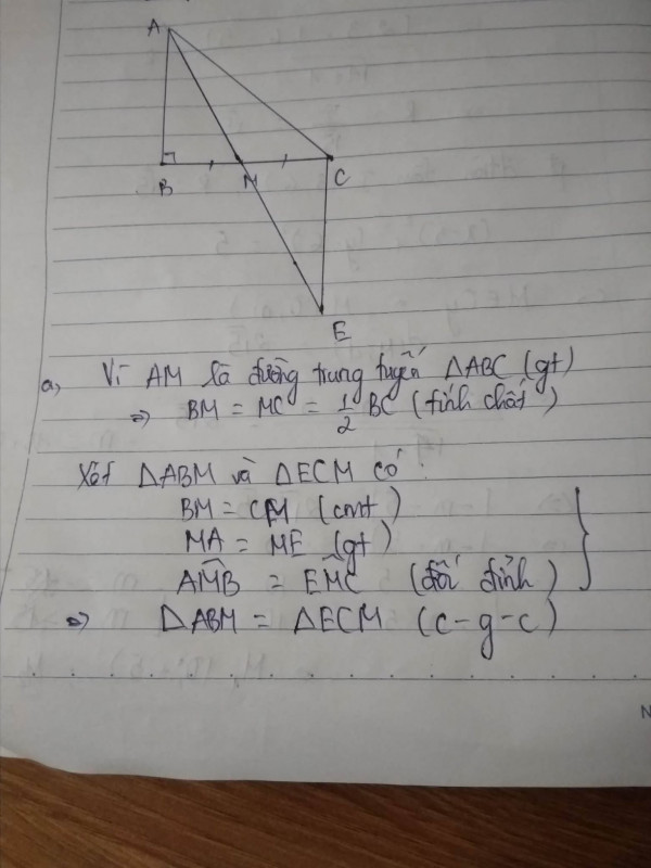 ∆ABC vuông tại B. Đường trung tuyến AM. Tia đối của tia MA lấy E/MA=ME