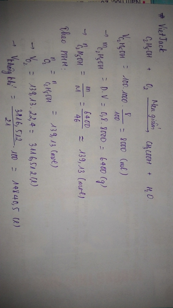Tính thể tích không khí đo ở dktc cần dùng để lên men 100l rượu 8 độ thành giấm ăn biết khối lượng etylic là 0,8g/cm3 oxi chiếm 21% thể tích không khí hiệu suất lên men là 100%