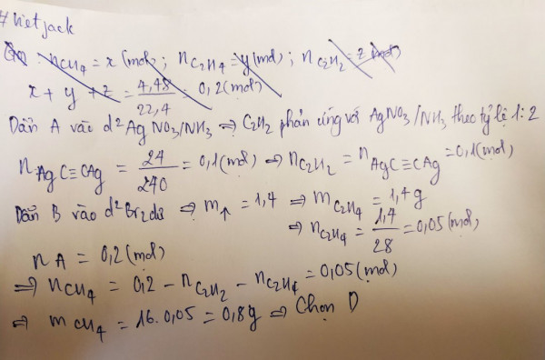 Hỗn hợp khí A gồm metan, etilen, và axetilen có thể tích là 4,48 lít (đktc). Dẫn A vào dung dịch AgNO3/NH3 dư thu được 24 gam kết tủa và hỗn hợp khí B bay ra. Dẫn B vào dung dịch brom dư thì thấy khối luonwjgvbinhf tăng lên 1,4 gam. Lượng khí metan trong hỗn hợp khí A ban đầu là