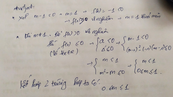 Cho f(x) = (m–1) – 2(m–1)x–1. Tìm m để bất phương trình f(x)>0 vô nghiệm.