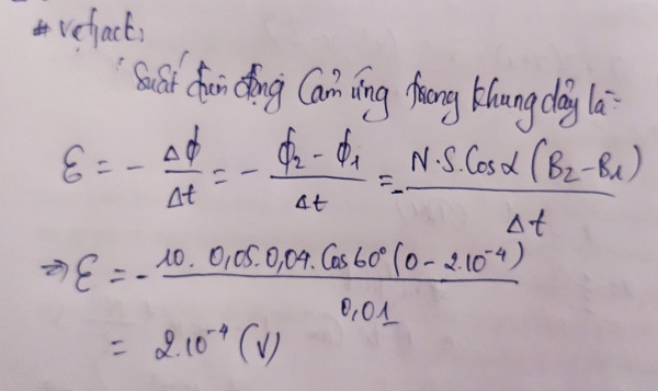 1 khung dây phẳng hcn 5×4cm, gồm 10 vòng dây đặt trong từ trường đều. Vécto cảm ứng từ hợp vs vecto pháp tuyến khung dây 1 góc 60° và độ lớn B =2.10^-4T. Ngta làm cho từ trường giảm đều đến 0 trong khoảng tg 0,01s. Suất điện động cảm ứng xuất hiện trong khung dây trong khoảng thời gian từ trường biến đổi là bao nhiêu.