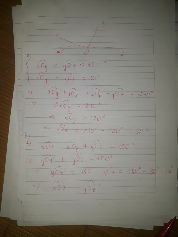 b) Oz' là tia đối của tia Oz . Hãy so sánh góc xOz và góc yOz'