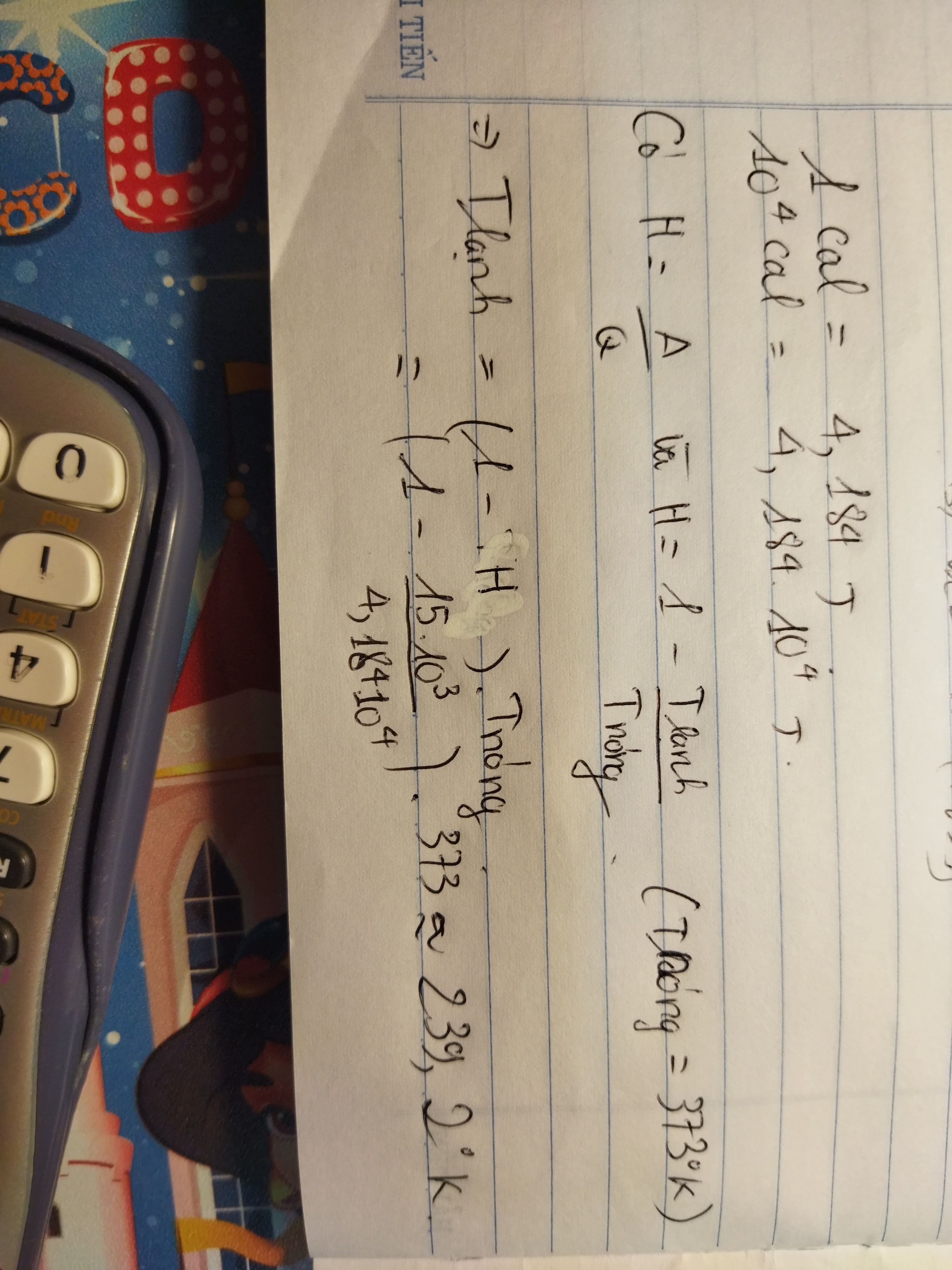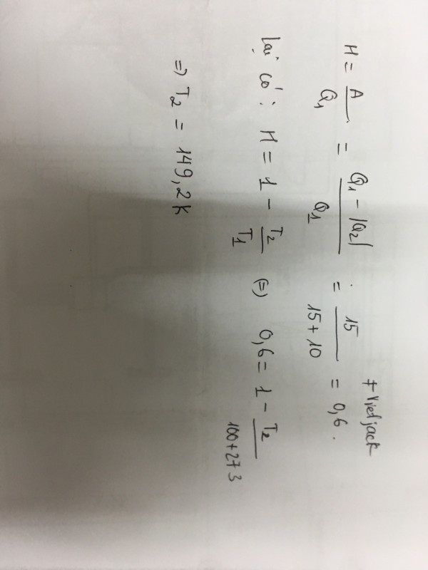 Khi thực hiện chu trình Carnot hệ nhận được nhiệt lượng 10 Kcal từ nguồn nóng và thực hiện công 15KJ. Nhiệt độ của nguồn nóng là 100°C.