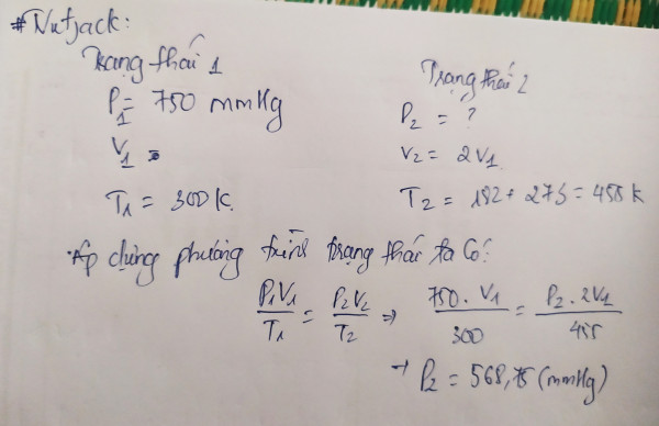 Một xi lanh có pit tông đóng kín chứa một khối khí ở nhiệt độ 27°C , áp suất 750 mmHg . Nung nóng khối khi đến nhiệt độ 182°C thì thể tích tăng gấp 2 lần . Tính áp suất của khối khí trong xi lanh lúc đó .