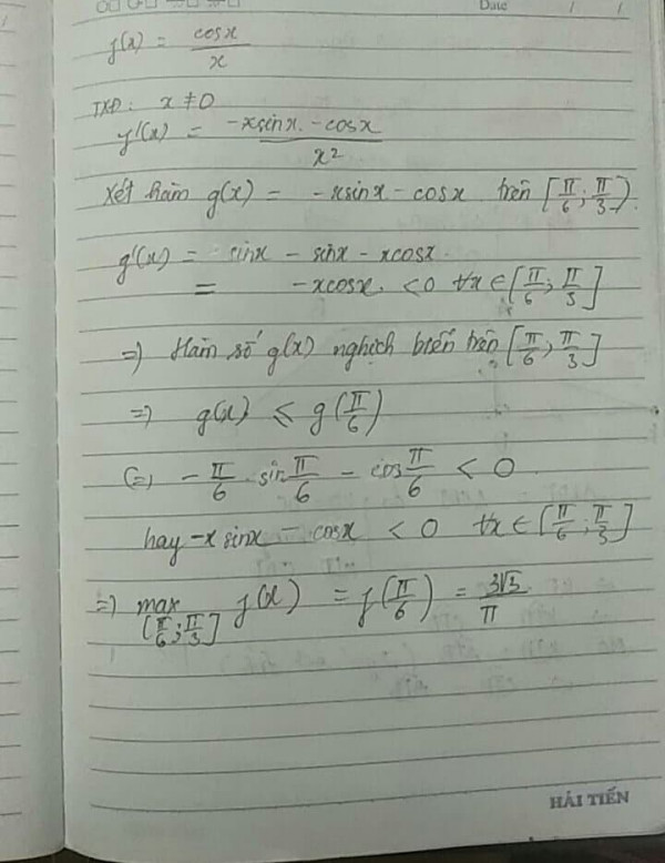 Giá trị lớn nhất của hàm số f(x)= cosx/x trên đoạn [π/6;π/3] là 1 số có dạng (a√b)/π với a, bt thuộc N*. Có bảo nhiêu cặp số(a,b) như vậy