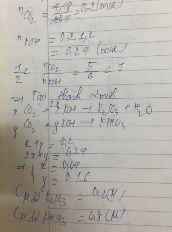 Cho 4.48l khí co2 td với 200 ml dd koh 1.2m A. Muối nào đc tạo thành B. Tính cm của dd thu đc. Coi V dd ko đổi