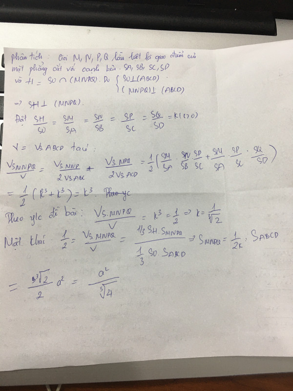 Một viên đá có dạng khối chóp tứ giác đều với tất cả các cạnh bằng nhau và bằng a. Người ta cưa viên đá đó theo mặt phẳng song song với mặt đáy của khối chóp để chia viên đá thành 2 phần có thể tích bằng nhau. Tính diện tích thiết diện viên đá bị cưa bởi mặt phẳng nói trên