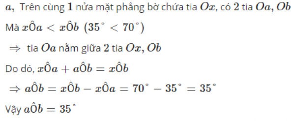 Trên cùng một nửa mặt phẳng bờ chứa tia Ox vẽ hai tia Oa và Ob sao cho góc xOa=35 độ và xOb= 70 độ