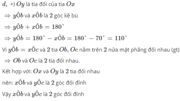d) Trên một nửa mặt phẳng bờ chứa tia Ox ko chứa tia Ob, vẽ tia Oc sao cho góc xOc=110 độ. Chứng tỏ rằng góc xOb và góc yOc là hai góc đối đỉnh