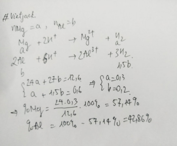 Cho 12,6 g hỗn hợp gồm Mg và Al tác dụng với dd H2SO4 loãng , phản ứng xảy ra hoàn toàn thu được 13,44 lít khí H2 đktc. Tính phần trăm khối lượng của Mg và Al trong h2 ban