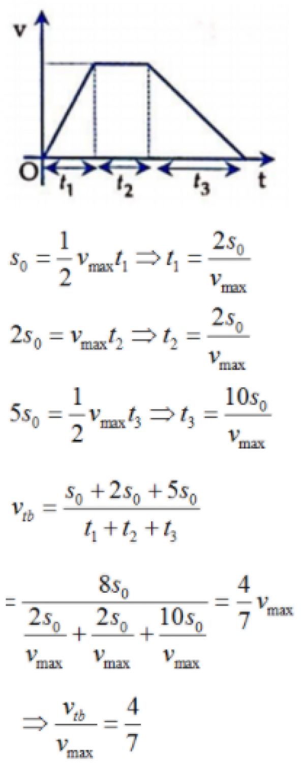 Một vật chuyển động thẳng và không đổi chiều chuyển động .Đầu tiên vật chuyển động NDĐ với vận tốc đầu bằng 0 trong quãng đường s0 ; tiếp theo vật chuyển động trong quãng đường 2s0 ; và cuối cùng vật chuyển động CDĐ và dừng lại sau khi đi thêm được quãng đường 5s0. Tỉ số giữa tốc độ trung bình và tốc độ cực đại Vmax của vật là bao nhiêu ?