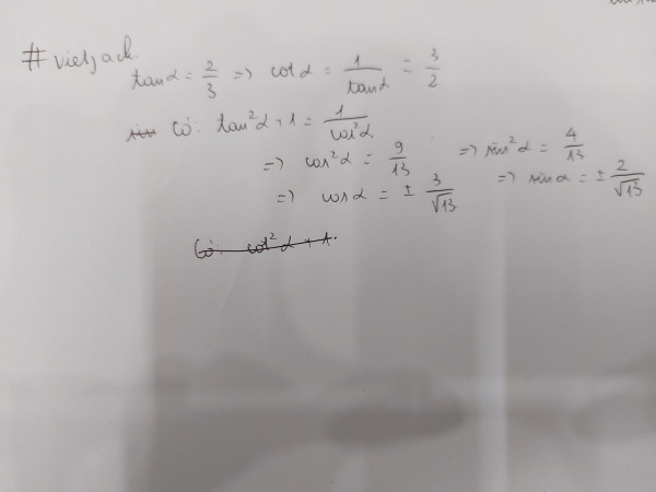 Cho tan a = 2/3 hãy tính sin a,cos a,cot a