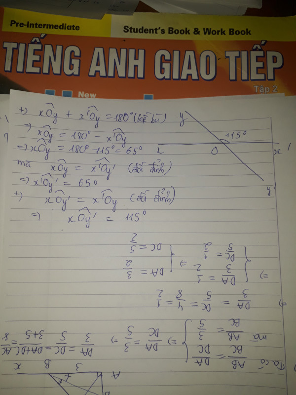 Cho hai đường thẳng xx’ và yy’ cắt nhau tại O, biết x’Oy=115 độ.Tính số đo cách góc tạo thành bởi hai đường thẳng xx’ và yy’.