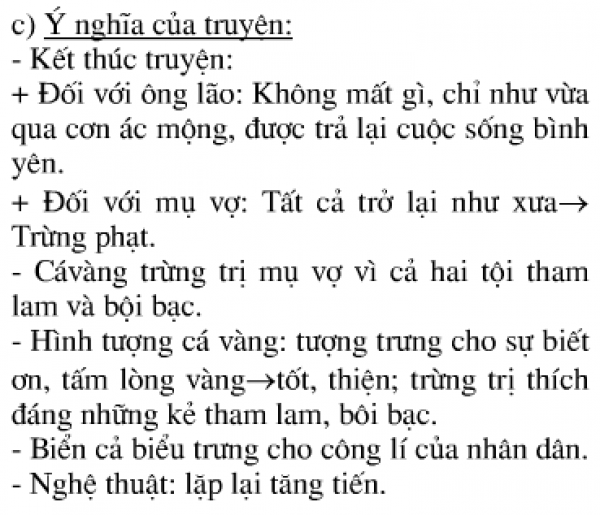 - Cá vàng thể hiện niềm biết ơn đối với những tấm lòng nhân hậu; cá vàng thể hiện ước mơ công lí về sự trừng phạt đối với kẻ vong ân bội nghĩa, đối với lòng tham lam, ích kỉ đến độc ác của con người.