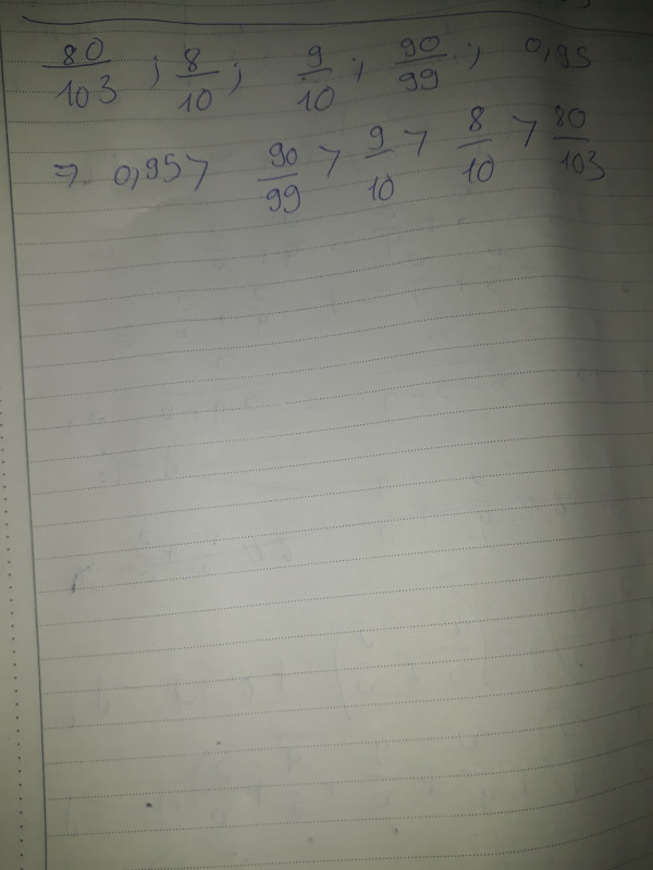 Xếp theo thứ tự từ lớn đến bé 80/103;8/10;9/10;90/99;0,95