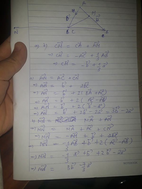 Cho tam giác ABC đặt AB,AC là hai vectơ a,b. Dựng các điểm M,N thỏa mãn AM bằng 1/3AB, CN bằng 2BC .