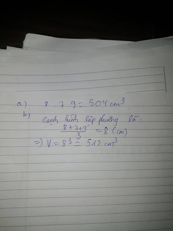 Bài1: Một hình hộp chữ nhật có chiều dài 8cm,chiều rộng 7cm và chiều cao 9cm.Một hình lập phương có cạnh bằng trung bình cộng của ba kích thước của hình hộp chữ nhật trên.Tính: