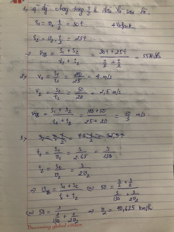 Câu 3: Một xe máy đi từ Do Sơn đến Hai Phong với vận tốc trung bình 50 km/h. Biết nữa quãng đường đầu đi với vận tốc 65km/h. Tính vận tốc của xe ở nữa quãng đường còn lại.