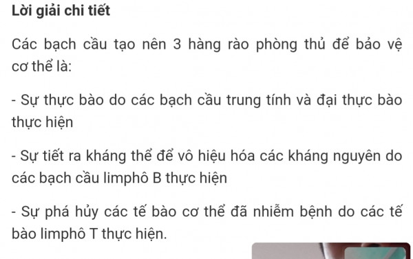 Các bạch cầu tạo nên 3 hàng rào phòng thủ để bảo vệ cơ thể là: