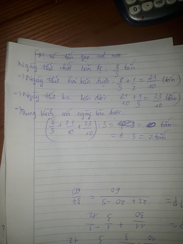 Một cửa hàng ngày đầu tiên bán được 8/5 tấn gạo. Ngày thứ hai bán nhiều hơn ngày đầu là 1/2 tấn gạo. Ngày thứ ba bán nhiều hơn ngày thứ hai là 1/5 tấn gạo. Hỏi trong ba ngày đó, trung ình mỗi cửa hàng đó bán được bao nhiêu tấn gạo ?