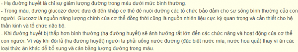 nước đường hay nước trái cây toàn chứa đường đôi, khi cho bệnh nhân uống nhanh chóng chuyển hoá thành đường đơn trong cơ thể và được ấp thụ giúp tăng lại mức đường huyết. Các loại thức ăn khác thường chứa đường đa, tinh bột, béo, protein,.. nhiều chất khác nhau, quá trình phân giải và hấp thu sẽ rất lâu và không hiệu quả nhanh cho bệnh nhân.