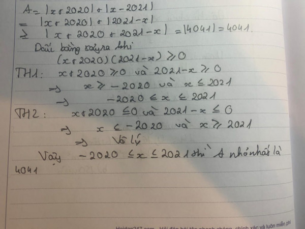 Tìm x để biểu thức sau đạt giá trị nhỏ nhất và chỉ ra giá trị nhỏ nhất ấy: A=|x+2020|+|x-2021|.