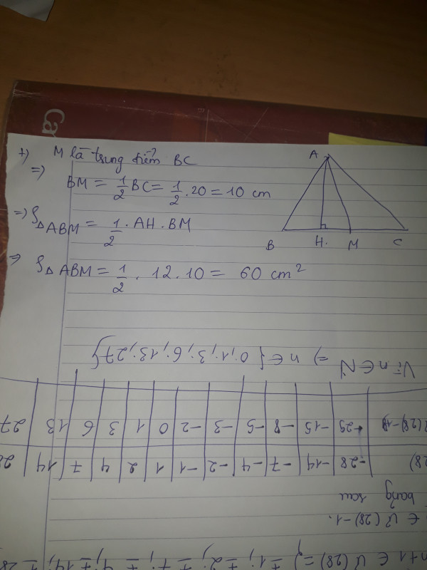 Cho hình tam giác ABC có độ dài đáy BC là 20 cm , chiều cao AH là 12 cm . Gọi M là trung điểm của cạnh đáy BC . Tính diện tích hình tam giác ABM.