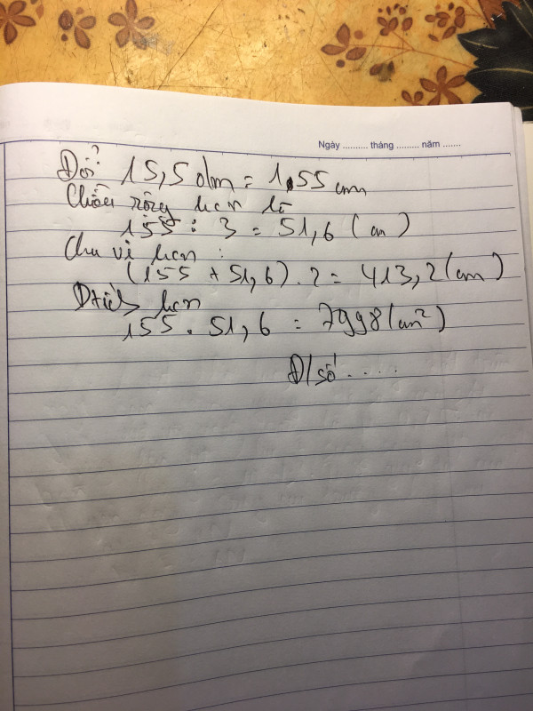 Một hình chữ nhật có chiều dài 15,5 dm chiều rộng bằng 1/3 chiều dài Tính chu vi và diện tích của hình đó