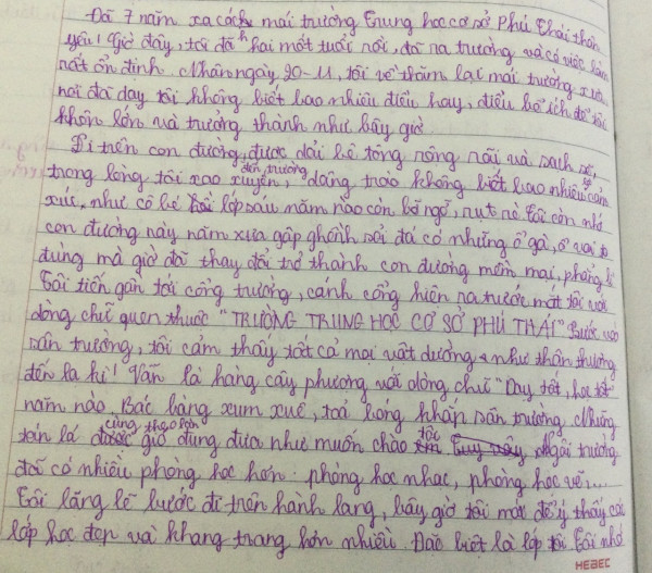 Em bước lại gần ngôi trường mến yêu, cái cổng hiện ra trước mắt. Nhìn hàng chữ “Trường trung học cơ sở Trần Phú” mà trong lòng thấy bâng khuâng vô cùng. Cổng trường bây giờ đã được quét vôi sạch sẽ. Bước vào cổng, hiện rõ trong đôi mắt em là kỉ niệm thơ ấu ngày nào, chơi đùa, bắn bi, rượt bắt nô nức dưới sân trường. Hàng cây xà cừ thuở trước chỉ cao tới tầng hai là cùng mà bây giờ đã xum xuê, toả bóng khắp sân trường. Khẽ chạm tay vào lớp vỏ xù xì, em thầm hỏi: “Cây ơi, mày còn nhớ tao không?” Cành cây lay động như muốn trả lời rằng: “Có chứ, làm sao cây này quên được cậu học trò Thăng ngày nào”. Em cười nhẹ rồi đi về phía sau trường, dãy núi trước kia bây giờ đã được khai phá làm thêm một dãy nhà cho các em học sinh lớp bảy, lớp tám. Học sinh bây giờ không như trước kia nữa, một ngày học luôn cả sáng lẫn chiều. Em quay mắt về phía căn phòng lớp em ngày nào. Nó không còn như xưa nữa mà rất khang trang, bốn cái quạt, sáu cái đèn và cái bảng to lớn cũng đủ biết điều ấy. Em tiến lên lầu, xem qua một lượt. Chà, thật là tuyệt, phòng thực hàng được trang bị toàn những máy tính hiện đại màn hình phẳng, cả thảy hơn bốn mươi chiếc. Chẳng phải hai người một máy như ngày nào nữa. Còn thư viện thì toàn những thiết bị hiện đại. Học sinh thời nay hơn trước kia nhiều quá. Đi qua dãy hành lang, bỗng em phát hiện ra một sân bóng rộng. Em chạy xuống, thấy một trái banh nằm lăn lóc. Chắc là mấy cậu học trò chơi xong quên không bỏ lại trường đây mà.. Em lấy chân lăn bóng trên nền cát rồi sút một cú nhẹ vào cái khung thành. Những kỉ niệm ngày ấy tuôn trào. Hồi ấy, nơi đây còn là một bãi đầy đất đá, còn cái khung thành chỉ là hai cái cọc và một thanh gỗ ở trên thôi, còn bây giờ, khung thành sắt có bao bọc lưới xung quanh, tuyệt quá. Bỗng, em nhớ ra là mình còn phải thăm thầy cô nên rảo nhanh bước về phía phòng truyền thống. Bước vào căn phòng, các thầy cô đang họp nên em không dám làm phiền mà đứng chờ. Họp xong, thầy cô tổ chức liên hoan mừng ngày vui, đến bây giờ, em mới đánh bạo tiến ra, chào thầy cô. Mọi người nhìn em với một chút ngỡ ngàng. Em thưa: