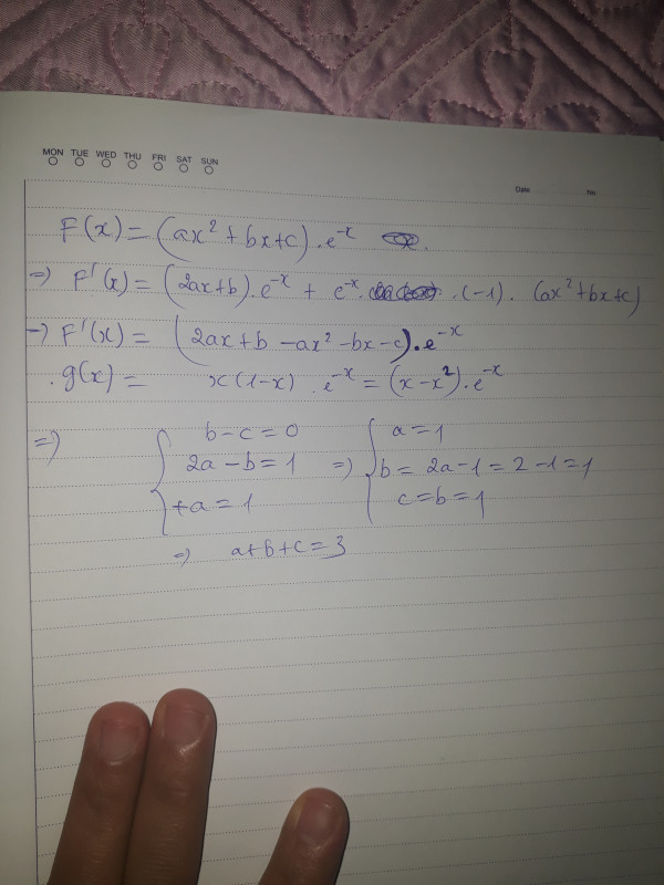 giả sử F(x)=(ax^2 + bx +c)e^-x là 1 nguyên hàm của g(x)=x(1-x)e^-x. tính tổng a b c
