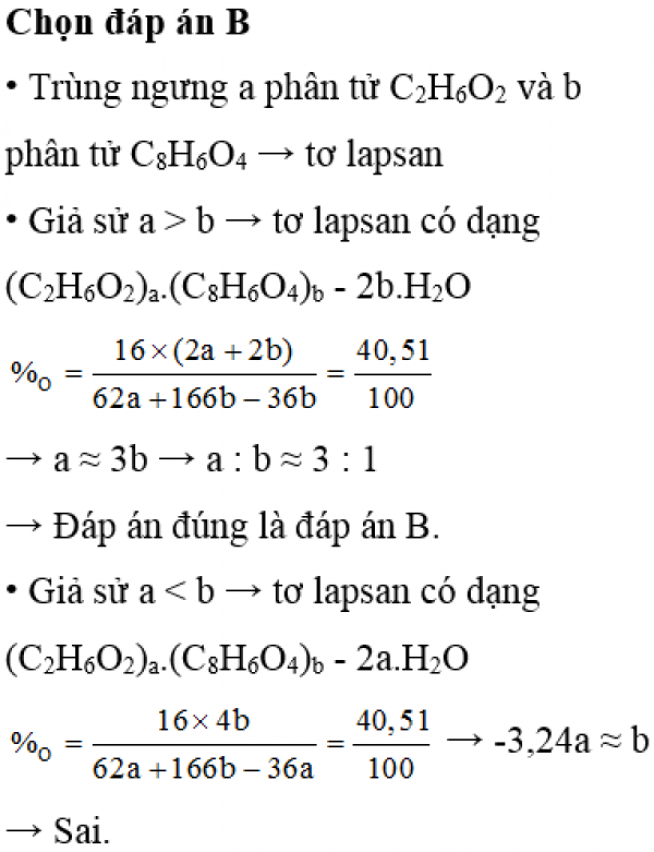 Khi tiến hành phản ứng trùng ngưng giữa etylen glicol và axit terephtalic ta thu được một tơ lapsan chứa 40,51% oxi về khối lượng. Tỉ lệ số mắt xích giữa etylen glicol và axit terephtalic trong mẫu tơ trên là