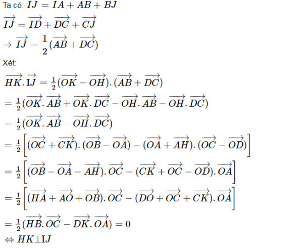 cho tứ giác ABCD, hai đường chéo cắt nhau tại O. Gọi H và K lầ lượt là trực tâm tam giác ABO và CDO. I , J tương ứng là cái trung điểm AD và BC. chứng minh HK vuông góc với IJ