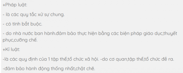 Câu 5: Phân biệt pháp luật và kỉ luật ? Cho ví dụ?