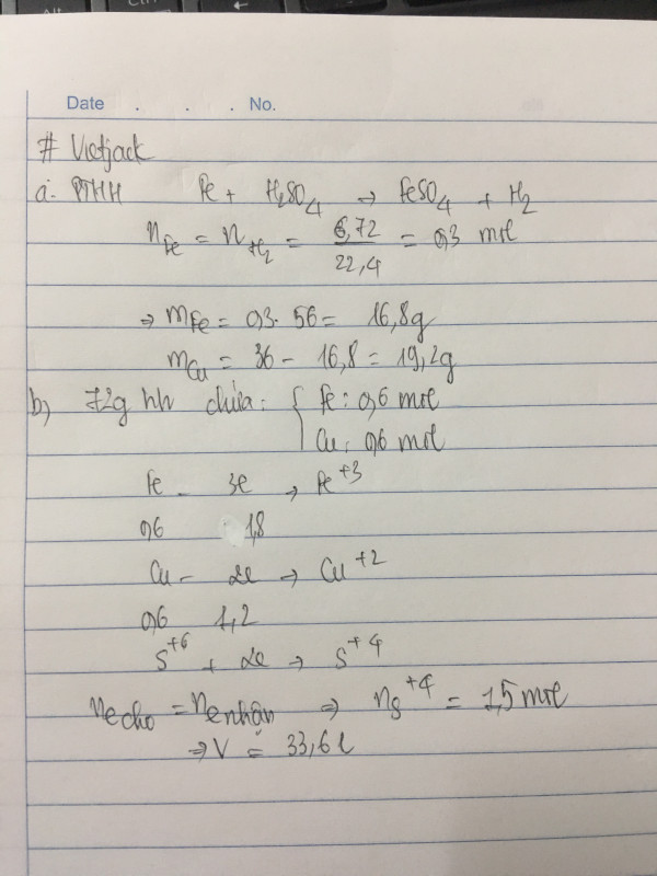 a, cho 36 g hỗn hợp gồm sắt và đồng tác dụng hết với dung dịch H2SO4 loãng dư thu được 6,72 lít khí dktc .Tìm khối lượng mỗi kim loại