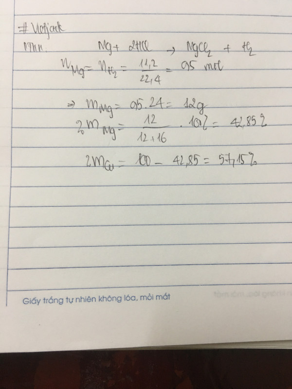 Cho m gam hỗn hợp 2 kim loại Mg và Cu tác dụng với dung dịch HCl dư. Sau khi phản ứng kết thúc thu được 16 gam chất rắn và 11.2 lít khí hidrohidro(dktc). Tính thành phần phần trăm của mỗi kim loại trong hỗn hớp kim loại