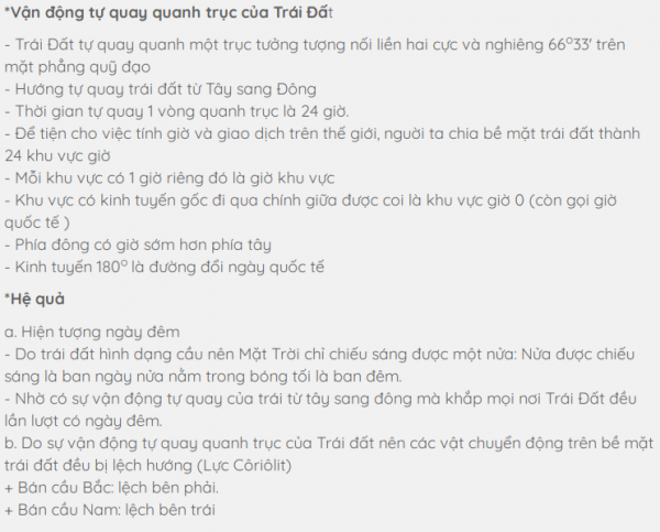 - trái đất tự quay quanh trục nối từ cuc bac den cuc nam có độ nghieng 66 độ 33' so voimat phang quy đạo -hướng quay tu tay sang dong -thoi gian trai dat tu quay mot vong quanh truc la 24 gio hệ qua cua no là hiện tượng ngày và đêm