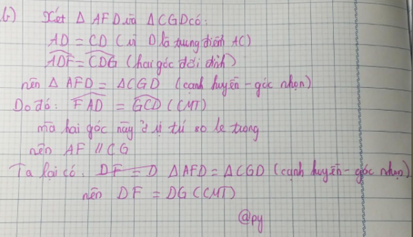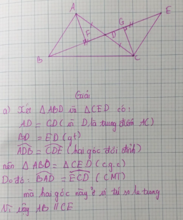 b) Kẻ AF vuông góc với BD tại F và CG vuông góc với DE tại G .C/M AF // CG va DF=DG.