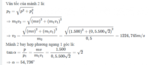 một viên đạn khối lượng 1kg đang bay theo phương thẳng đứng từ dưới lên với vận tốc 500m/s thì nổ thành hai mảnh có khối lượng bằng nhau.Mảnh thứ nhất bay theo phương ngang với vận tốc 500 căn 2.Hỏi mảnh thứ hai bay theo phương với vận tốc bao nhiêu ?